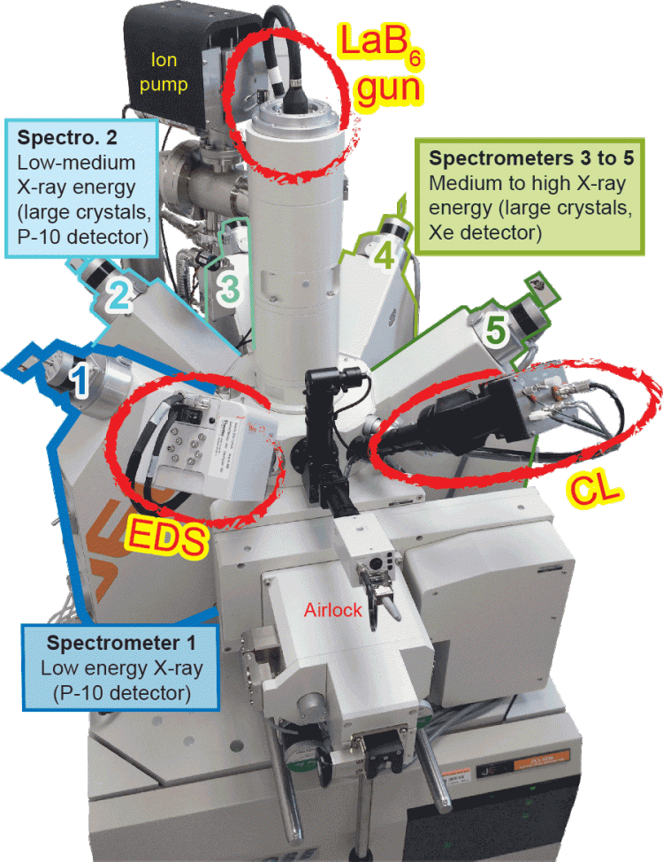The CU EMP lab is equipped with a JEOL 8230 Superprobe; this instrument was acquired and installed 2016 with the support of an NSF MRI grant and a cost matching contribution from CU Boulder. This state of the art instrument is equipped with five wavelength dispersive spectrometers. Four of these spectrometers are outfitted with JEOL large area (L-type) monochromator crystals which yield x-ray count rates that are a factor of 2-3 higher than standard J-type spectrometers. The L-type spectrometers provide enhanced instrument sensitivity which greatly improves the performance of the instrument in the analysis of trace elements (concentrations <500ppm). The instrument is also equipped with a Thermo UltraDry energy dispersive x-ray spectrometer (EDS) and a panchromatic cathodoluminescence detector. The JEOL 8230 vacuum system is completely dry-pumped, employing a combination of a scroll pump (roughing), turbo molecular pump (hi-vac), and sputter ion pump (electron gun assembly); this vacuum system eliminates hydrocarbon contamination on polished sample surfaces during long beam exposures. The lack of hydrocarbon contamination produces optimal conditions for the accurate analysis of light elements (Z<9) and trace elements.