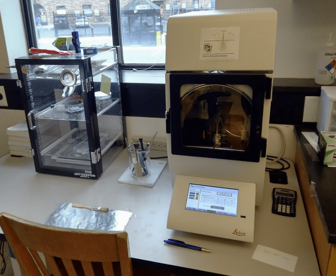 For non-geological samples, specimens can be mounted in 25mm or 30mm epoxy wafers and polished to the appropriate specification. Non electrically conductive samples (i.e., silicates) must be coated with thin film of conductive material. For quantitative analysis a carbon thin film of 15-20 nm (~100-150 carbon atoms thick!) thick is typically deposited thermal pulse evaporation. The EMP laboratory is equipped with at Leica ACE600 high vacuum carbon evaporator which is capable of depositing and measuring carbon thin films with an accuracy of +/- 1 nm.