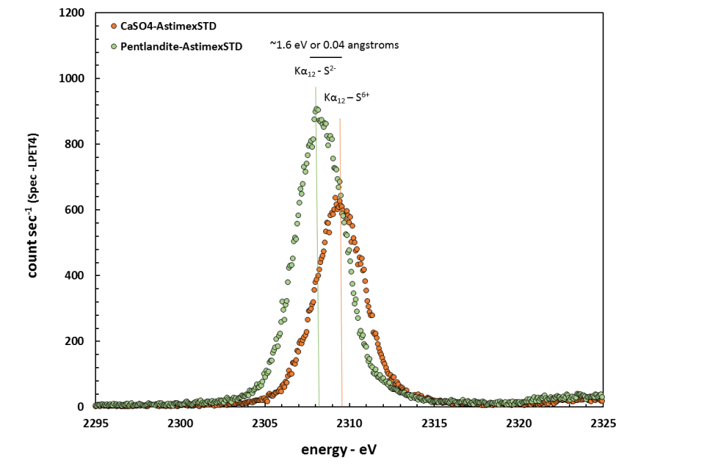 The plot of WDS spectra for pentlandite (NiS) and anhydrite (CaSO4) shown below illustrates this effect (shown in energy space rather than wavelength). Concerting eV to wavelength in angstroms, the S Kα centroid measured for NiS is 5.371 angstroms whereas the S Kα centroid measured for CaSO4 is 5.368 angstroms. This corresponds to an energy difference of about 1.6 eV and is a fantastic illustration of the superior ability of the WD spectrometers to resolve extremely small wavelength differences.