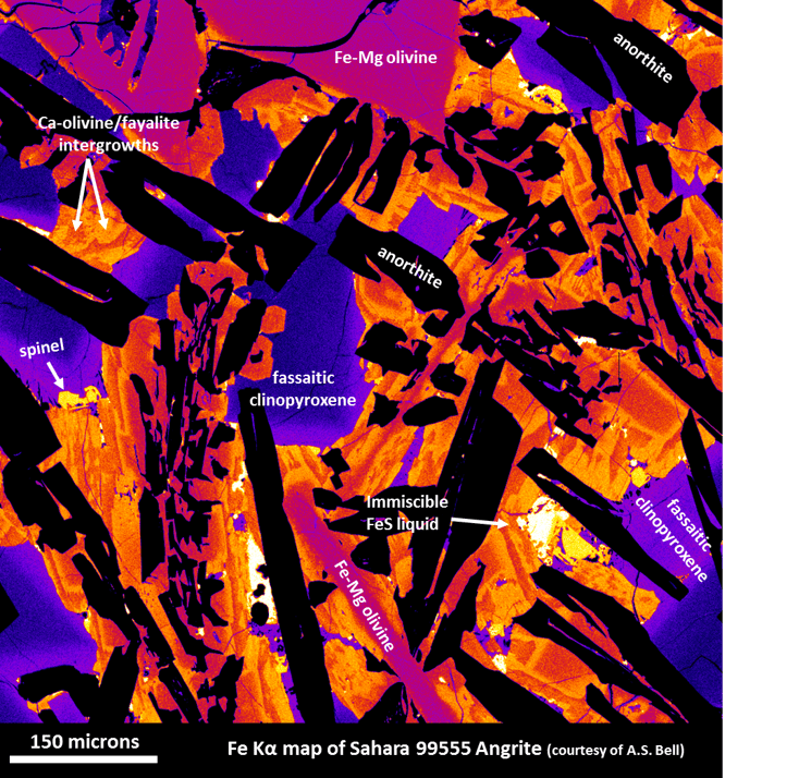 Maps of element distribution can also be produced using the WDS spectrometers. The image below is a false-colored and annotated Fe Kα x-ray map of the phase assemblage in the “basaltic” meteorite Sahara 99555 (SAH 99555 is classified as an angrite and is one of the oldest igneous rocks in the solar system at 4.55 Ga).